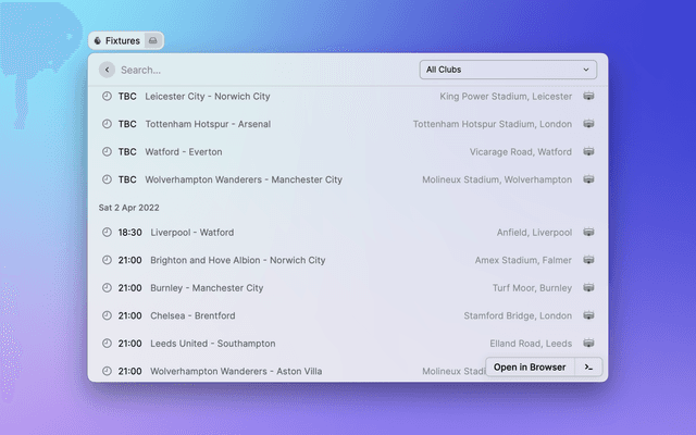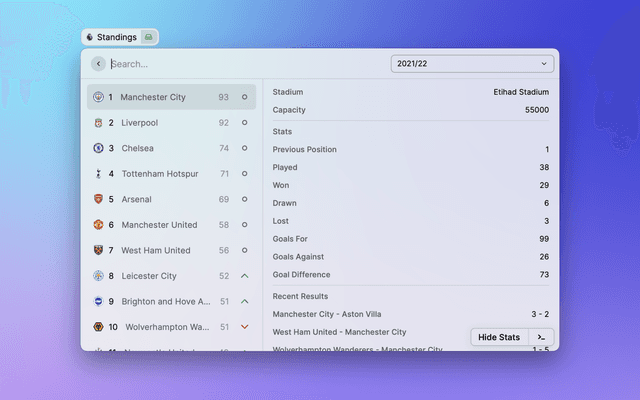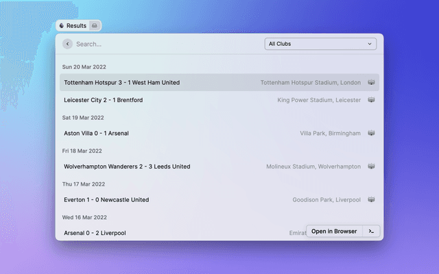 View the latest Premier League tables, form guides and season archives in Raycast