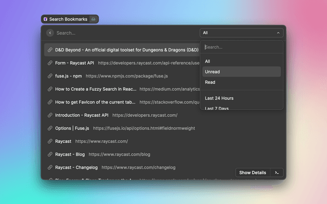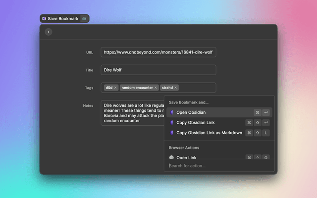 Obsidian Bookmarks lets you use Raycast and Obsidian as a place to manage your bookmarks.